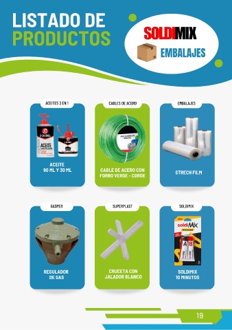 LISTADO DE PRODUCTOS EMBALAJES ACEITES 3 EN 1 CABLES DE ACERO EMBALAJES ACEITE 90 ML Y 30 ML CABLE DE ACERO CON STRECH FILM FORRO VERDE - CORDE GASPER SUPERPLAST SOLDIMIX REGULADOR CRUCETA CON SOLDIMIX DE GAS JALADOR BLANCO 10 MINUTOS 19