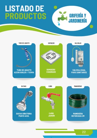 LISTADO DE PRODUCTOS GRIFERÍA Y JARDINERÍA TUBO DE ABASTO SUMIDERO VÁLVULAS TUBO DE ABASTO SUMIDERO VALVULA DUAL ACERO BOILER / TERMA CUADRADO PARA SANITARIOS DUCHAS CAÑO MANGUERAS DUCHA GIRATORIA CAÑO MANGUERA PUNTO AZUL JARDÍN REFORZADA 2M 22 Í